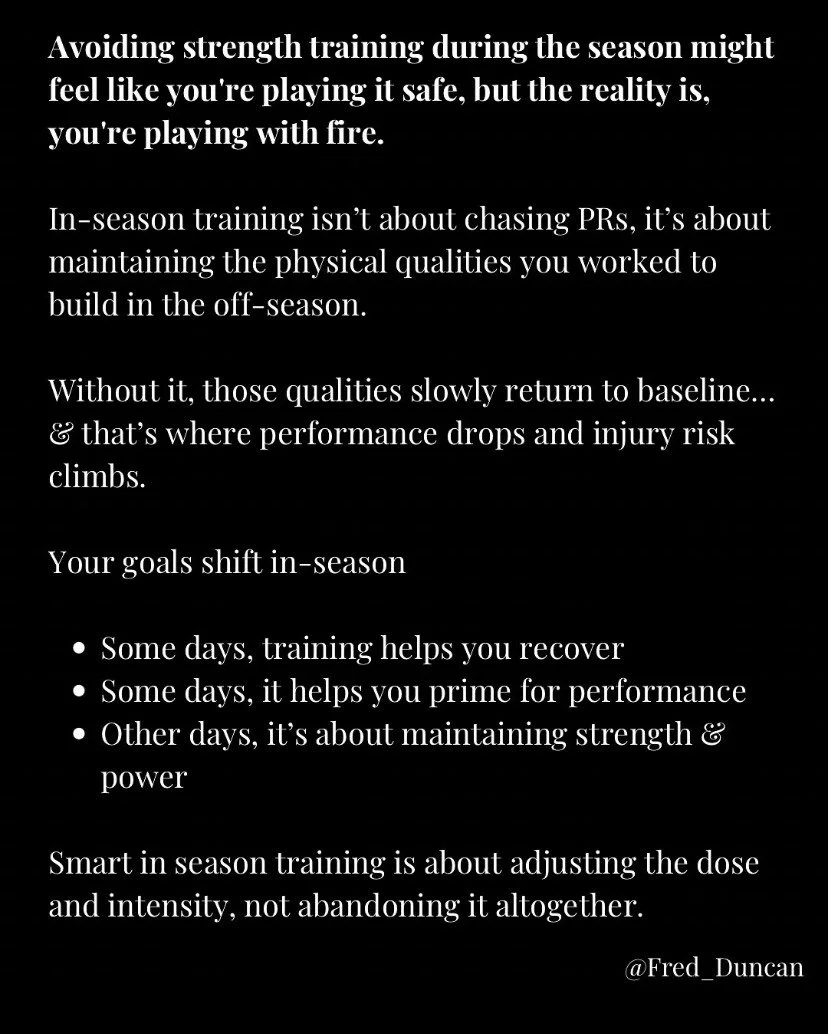 · How many times a week should your athlete train while in-season? Two training sessions per week along with structured nutrition is recommended to maintain off-season gains and decrease the likelihood of injuries. Off-season athletes should be training 3-4x per week to see large, statistical results.